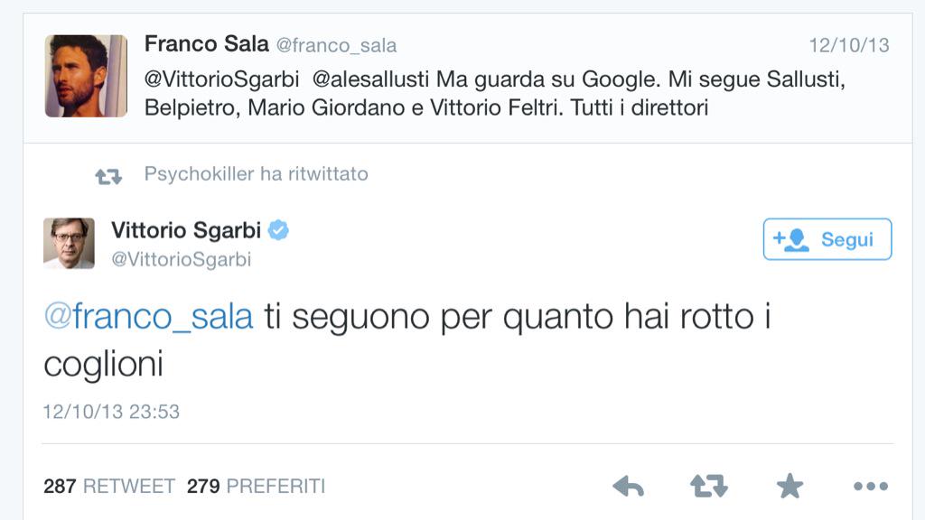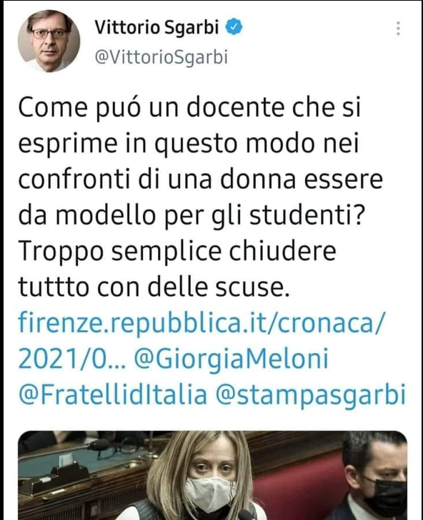 Vittorio umberto antonio maria sgarbi (ferrara, 8 maggio 1952) è un critico d'arte, storico dell'arte, saggista, politico, personaggio televisivo e opinionista italiano. Vittorio sgarbi recentemente ha dichiarato che sarà l'assessore dei miracoli per roma, nel caso in cui dovesse vincere enrico michetti. Forti accuse contro i maneskin. Nel rispetto del provvedimento emanato, in data 8 maggio 2014, dal garante per la protezione dei dati personali, si avvisano i lettori che questo sito si serve dei cookie per fornire servizi e per effettuare analisi statistiche completamente anonime. Vittorio sgarbi su papa francesco: Un'occhiata al social network dei cinguetti avvalora l'ipotesi. I protagonisti sono vittorio sgarbi e un certo paolovis78. Chiedo per un amico», scrive su twitter vittorio sgarbi, politico e critico d'arte, postando le frasi più «significative» del repertorio politicamente scorretto a corredo della sua tesi, che. Gli ultimi tweet di @vittoriosgarbi Esportazione illecita di un quadro. Con dedica personalizzata e 16 illustrazioni di staino. Lo dice con un tweet elon musk, l'imprenditore sudafricano considerato il nuovo steve jobs che ha inventato tesla, l'azienda di palo alto produttrice di auto elettriche. Non si fermano gli attacchi alla band italiana vincitrice dell'ultimo eurovision song contest, dopo la francia è stato il turno della bielorussia.